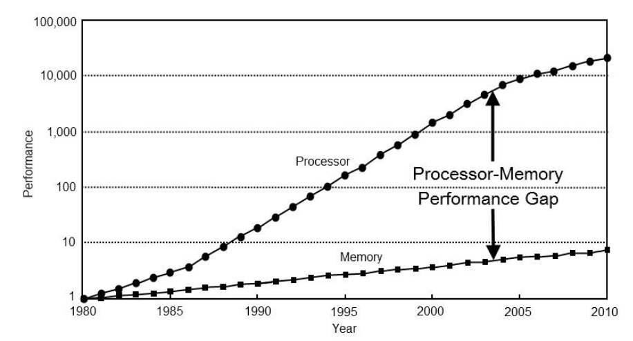 The problem that this picture represents is that the CPU performance has improved tremendously over the years (y axis is in a logarithmic scale), while the memory performance increased at a much slower pace: